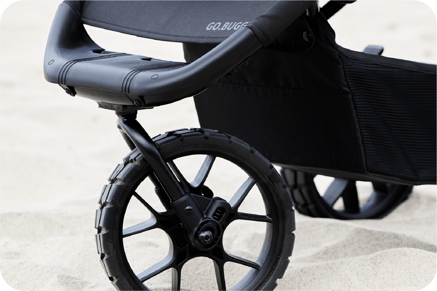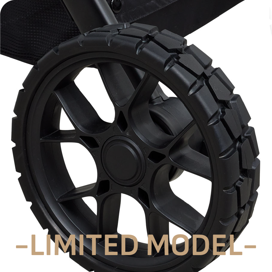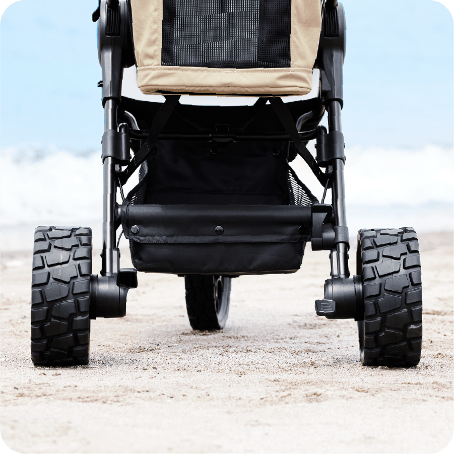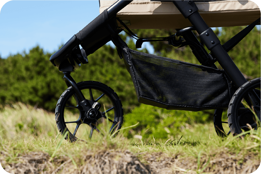 (限定100セット)「GO.BUGGY Dog R/T」専用※3のワイドリヤタイヤは、幅100mmの極太仕様。高い安定性と走破性を備えているため、砂利道や段差などの悪路でも安心して走行できます。舗装路だけでなくアウトドアシーンにも最適で、ワンちゃんと一緒に気軽にガンガン出かけられる心強いタイヤです。