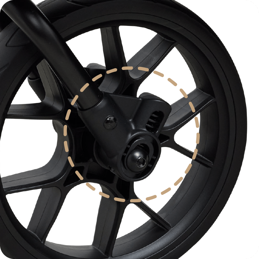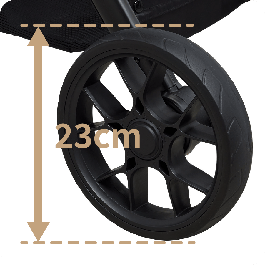 ビッグな23センチのノーパンクPUタイヤを装備しているため、定期的なエアー調整を行う必要がなく、空気漏れやパンクといったトラブルの心配も一切ありません。さらに、しっかりとした弾力性を備えているので、段差や砂利道などの悪路でもスムーズに走行でき、ワンちゃんが快適に乗れる高い走行性能を実現しています。