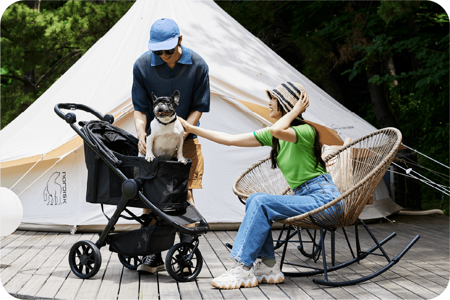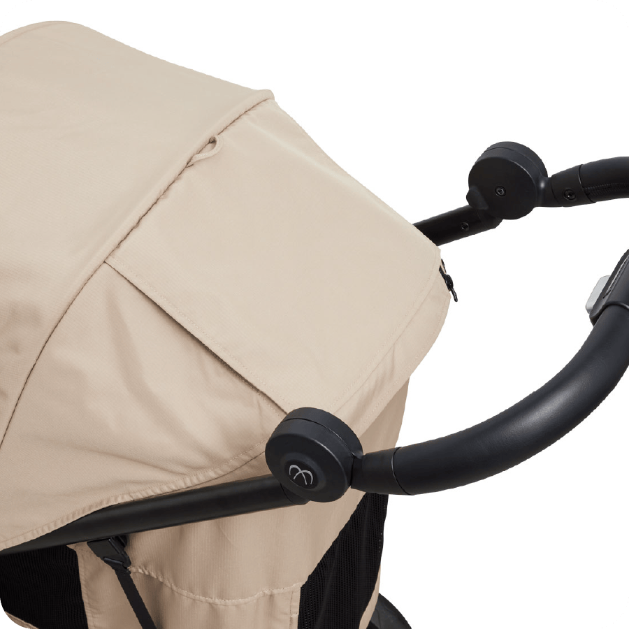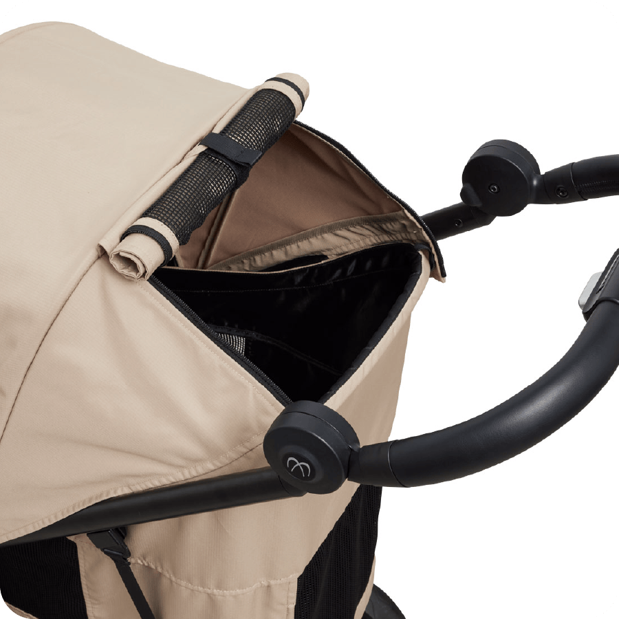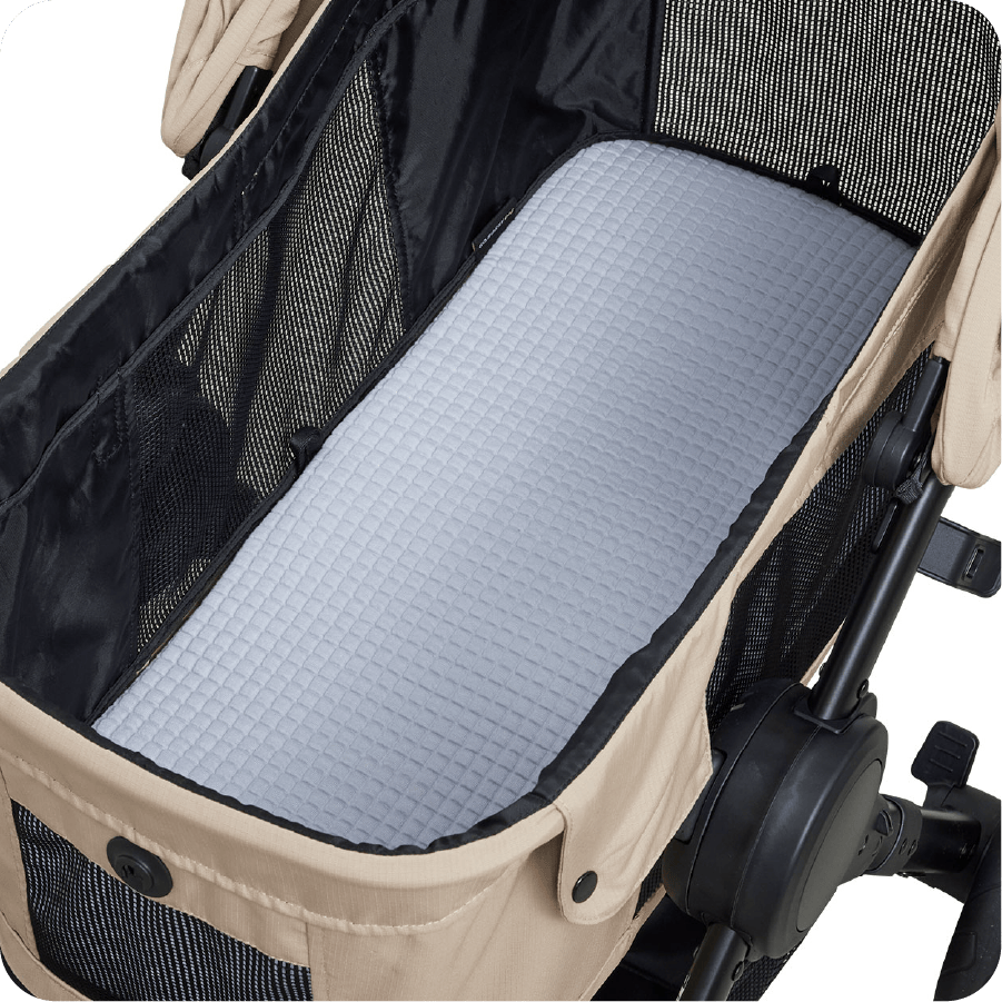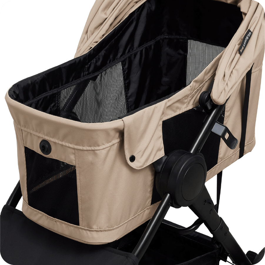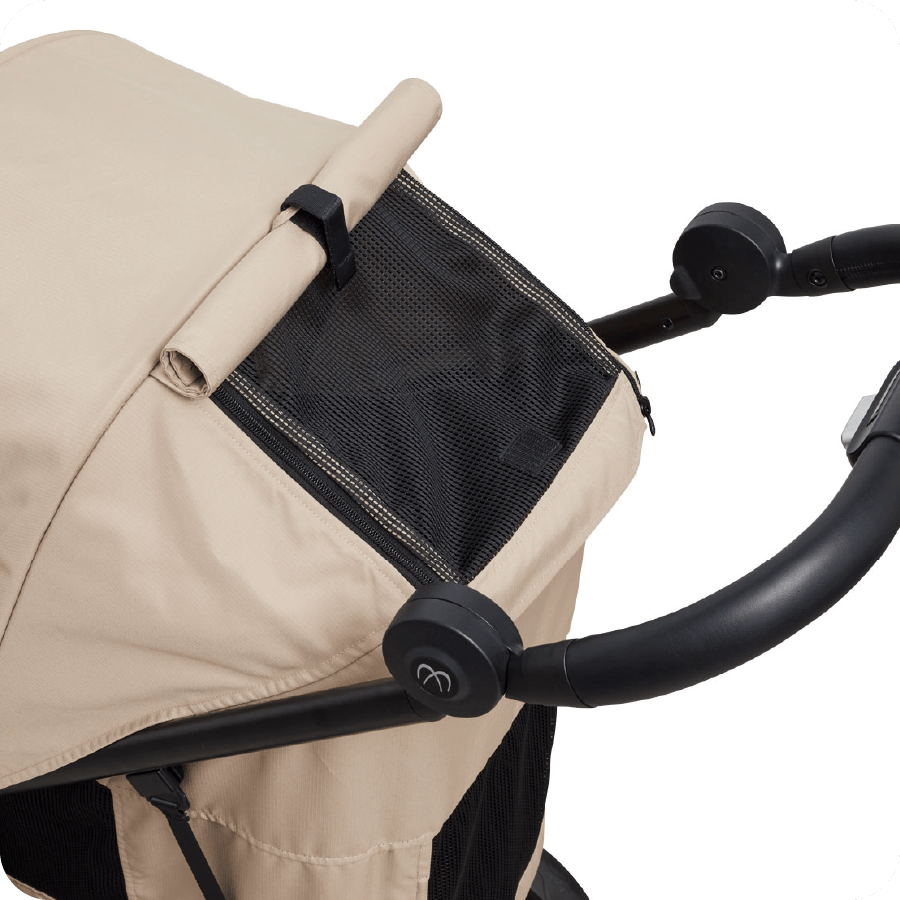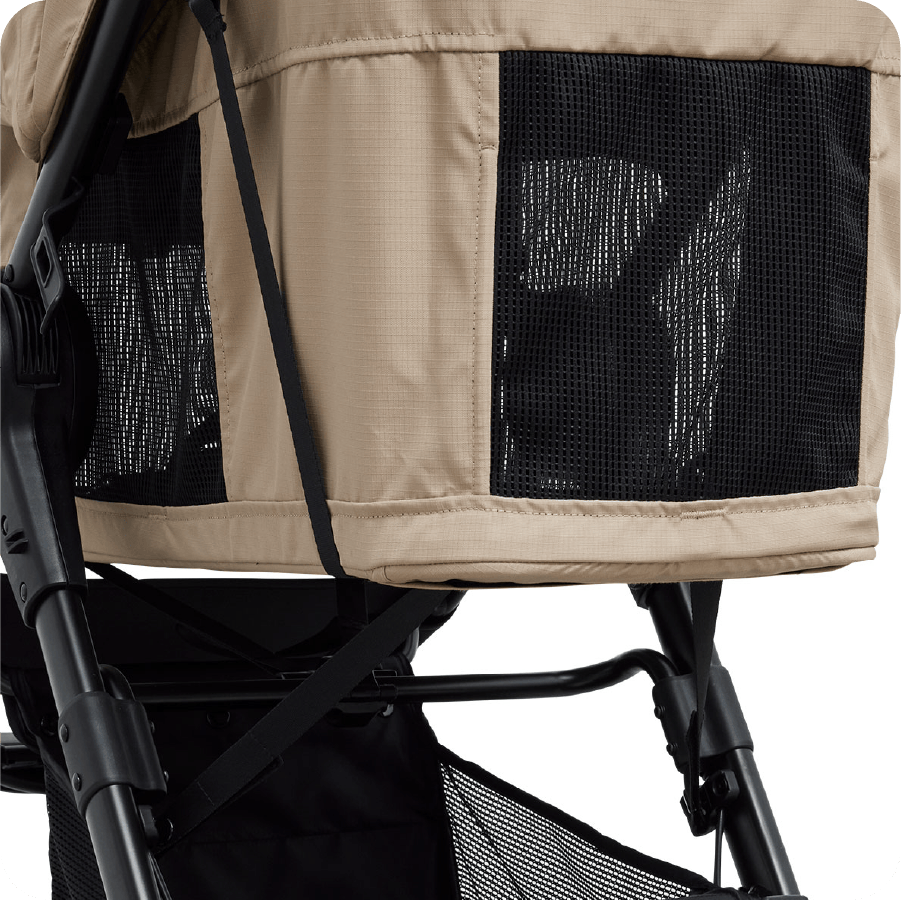 シェード後方には開閉可能なメッシュウインドウを装備。シェードを閉じていても通気性を妨げず、コット内の熱こもりをしっかり軽減します。さらに、ワンちゃんとの触れ合いを楽しめるフルオープン、おやすみ時に安心のフルクローズなど、用途に合わせて3通りの使い方が可能です。どんなシーンでも快適さと使いやすさを両立しています。